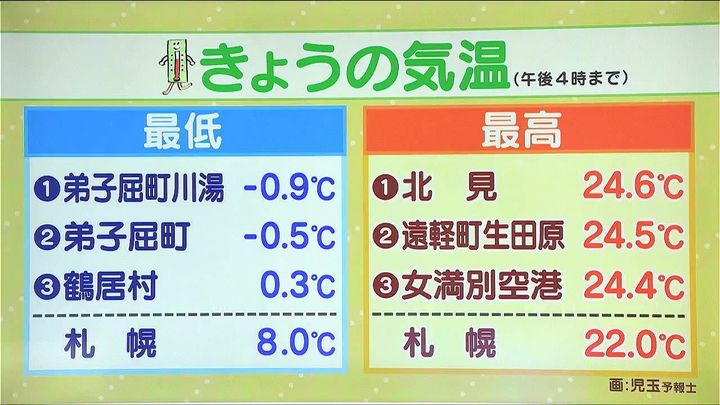 最低気温は、釧路北部の弟子屈町川湯で−0.9度、弟子屈町で‐0.5度でした。直近30年を見ると6月頭に冬日になる年も多々あるので、そこまで珍しいことではありません。朝は冷えましたが、日中は気温が上がりました。午後4時までの最高気温は、北見で24.6度と夏日一歩手前。ちなみに弟子屈町でも20度くらいまで上がり、寒暖差が大きくなりました。あす28日(水)は25度以上の夏日になるところもあります。