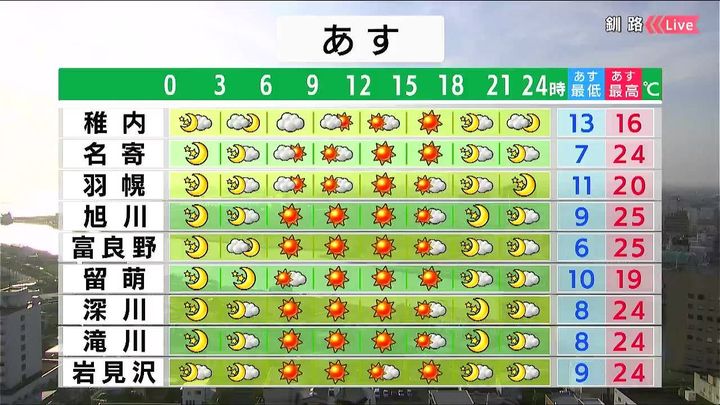 稚内方面で曇る時間がある他は、日差しに恵まれます。最高気温は内陸で25度くらいまで上がり、富良野も25度の夏日予想です。昼間は半袖で過ごせそうです。
