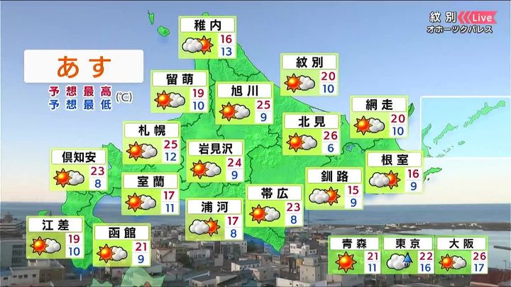 札幌や倶知安、函館など広く晴れて、日中は20度を超えるでしょう。苫小牧や浦河など海岸部は雲が広がりやすく、昼間でも羽織る物が必要です。