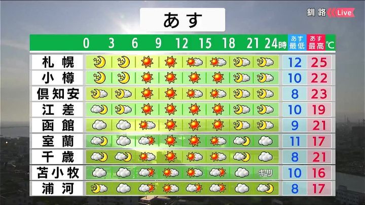 あすも広く晴れるでしょう。最低気温はきょう27日(火)の朝より3度前後高く、内陸の寒さは緩みます。最高気温もきょうより高く北見は26度、札幌や旭川も25度の夏日になるでしょう。