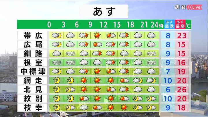 帯広やオホーツク海側は晴れて、朝晩と日中の気温差が大きくなります。北見も朝と日中で20度差が開きそうです。釧路や根室は低い雲や霧がかかりやすくなるでしょう。