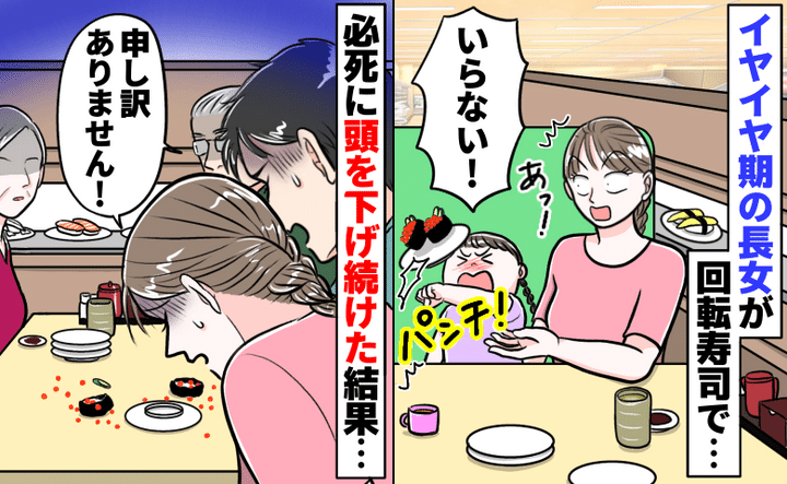 3. イヤイヤ期の娘が食事を拒否してお寿司をパンチ「いらない!」隣の席に散乱…夫婦で必死に謝り続けた結果