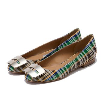 チェック柄プレートパンプス(1.5)/ペリーコ(アマン) フレッシュなオレンジや緑を混ぜた高揚感のあるチェック。目を引くゴールドの飾りでクラス感を上乗せ。