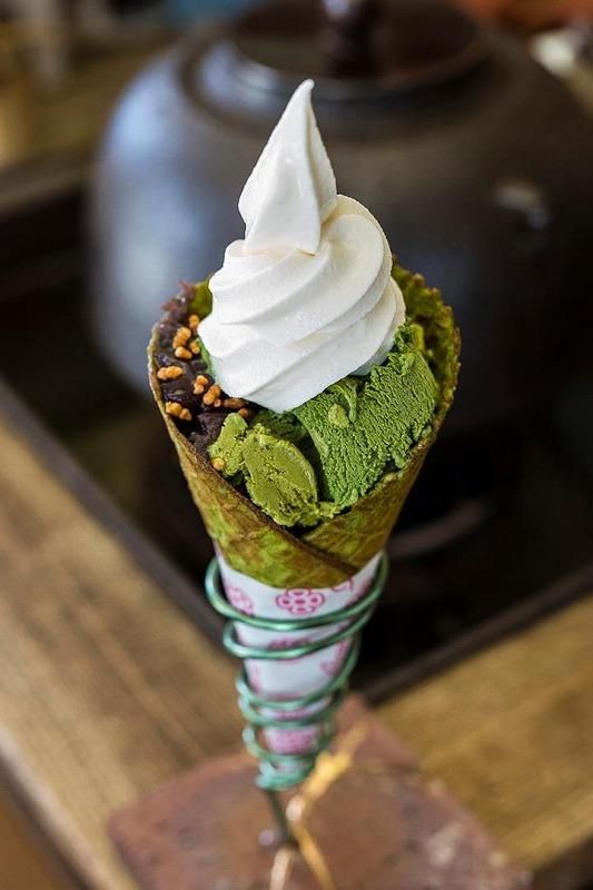 日本茶専門店が北海道で熟成した濃い抹茶をたっぷり練り込んでアイスクリームを作り、特注の餡子と北海道産玄米を添えてその上に十勝の牛乳だけで作った甘みを極限まで抑えたソフトクリームを載せました。
