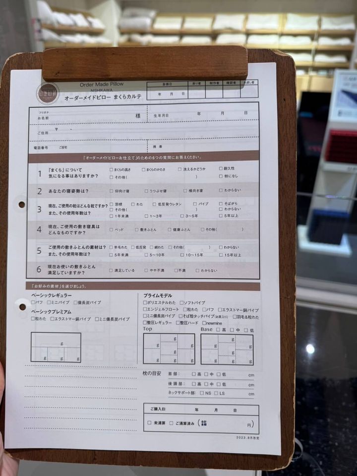 眠りのプロフェッショナル・nishikawaのスリープマスターが、自分にぴったり合ったまくら選びを丁寧にサポート。睡眠の環境や寝具に関する質問が並ぶ「まくらカルテ」をもとに、カウンセリングが行われます。