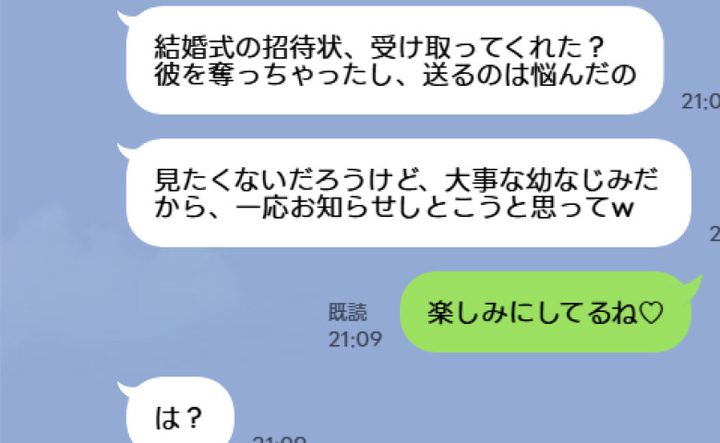 大方、幼なじみは招待しても私は出席しないと思っていたのでしょう。それでも、どうしても結婚に至ったことだけは私に伝えたかったのだと思います。「勝ち組」として幸せそうな自分を私に見せつけて優越感に浸りたかった。それが、彼女の本音でしょう。