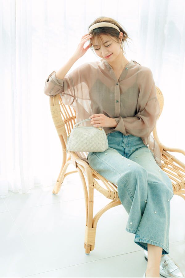 シャツ¥18,700/マイカ アンド ディール(マイカ アンド ディール 恵比寿店) デニムパンツ¥2,599/GRL バッグ¥39,600/ジャンニ キアリーニ(ジャンニ キアリーニ 銀座店) カチューシャ¥26,400/アレクサンドル ドゥ パリ(アレクサンドル ドゥ パリ GINZA SIX店) イヤリング¥6,820/イットアトリエ(14 SHOWROOM) ローファー¥25,300/卑弥呼