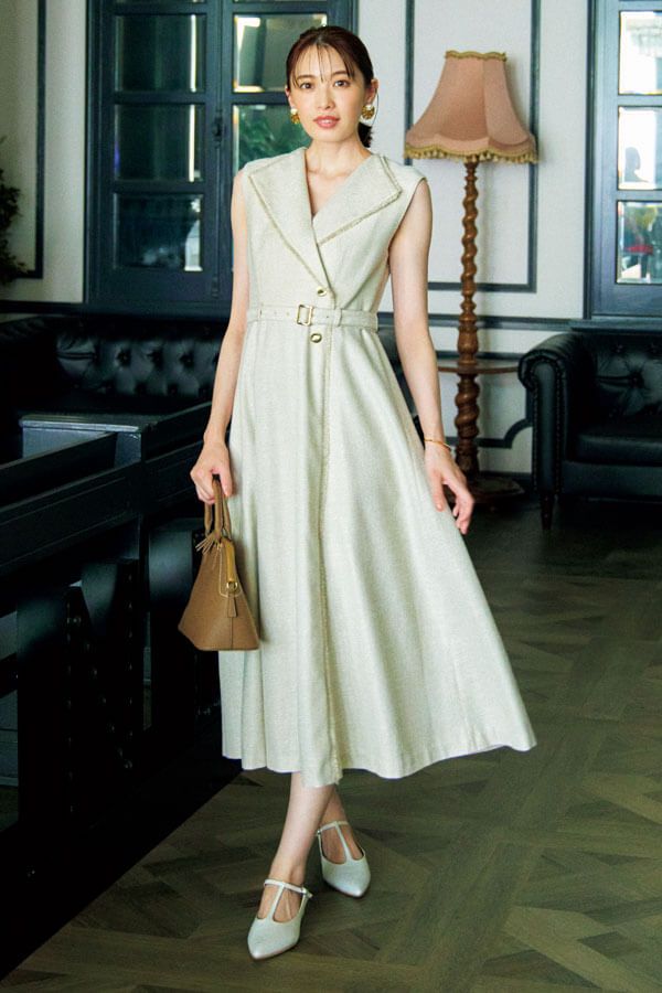 リネンライクのツイード素材が初夏の通勤シーンにフィット。顔まわりが華やぐ大きめのカラーもレディなオフィススタイルをあと押し。細部に施した金ボタンやバックルもリッチな存在感を好演。