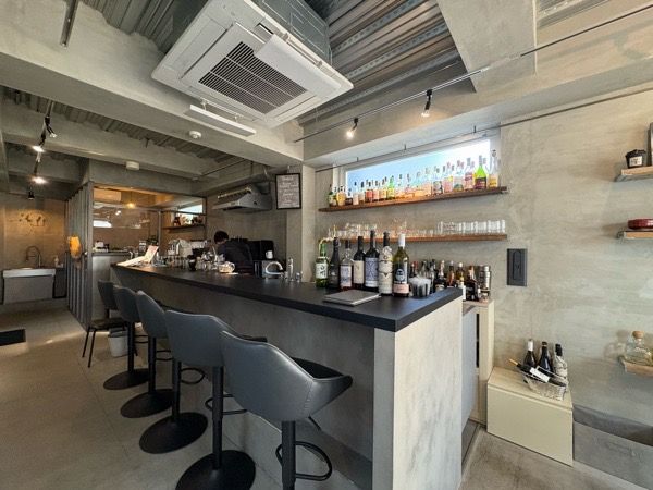 黒とグレーで統一感のあるカウンター席。テーブル席(個室)もあって、ランチもある模様。