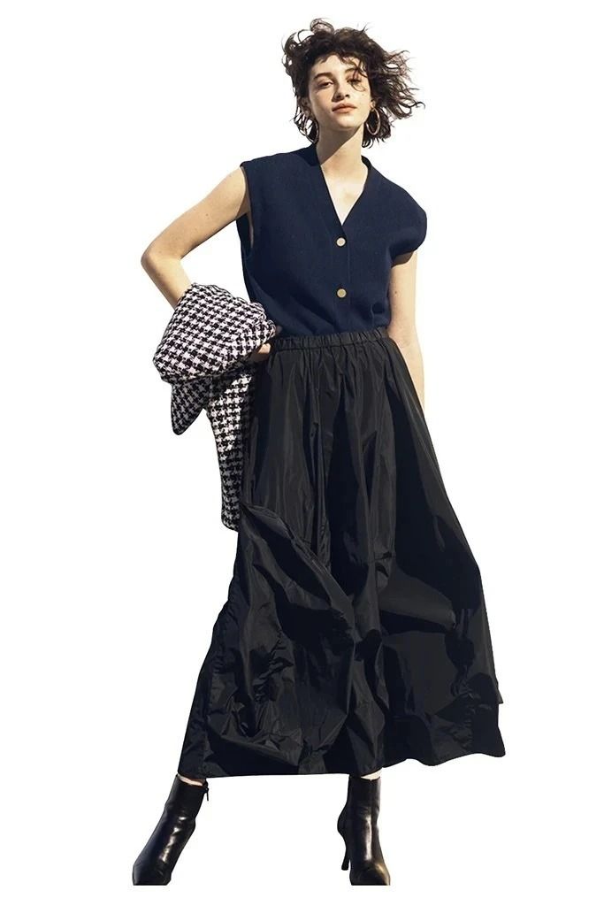 脚線を目立たせず、ウエストはキュッと見えるシルエット。ネイビーのベストとツヤ感のあるフレアスカートで品の良さをたたえたノーブルなスタイリングに。タフタやナイロンなど、ハリのある素材により美しい曲線を保てる。 スカート/ENFOLD ニットベスト/ADAWAS(ショールーム セッション)