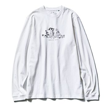 白プリントTシャツ/エドモンド ストゥディオ(THIRD MAGAZINE) アイキャッチーな絵柄をモノクロでシックに。インナーとしてジャケットをハズす役割を担えるのも、間違いない白黒ならでは。