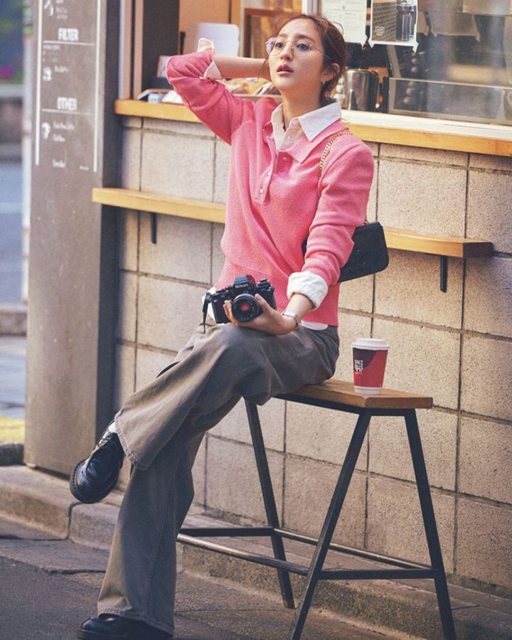5月28 日(水)、地味見えしやすいポロニットは、ピンクを選んでパッと華やぐ印象に昇華。さらに大人顔で着こなすならインナーに白シャツを加えてレイヤードすると、知的さと洒落感が漂いオフィス映えします。ボトムスはグレーデニムでカジュアルダウンしつつ、カラーアイテムとのニュアンス配色を楽しんで。小物は黒レザーでキリッと引き立てると好バランスです。