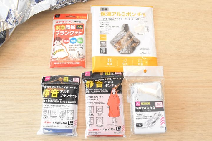 上段左は一般的なアルミブランケット(110円)、上段右はポンチョタイプ(110円)、下段左は静音タイプのアルミブランケット(220円)、下段中は静音のポンチョタイプ(330円)、下段右は寝袋タイプ(330円)です。