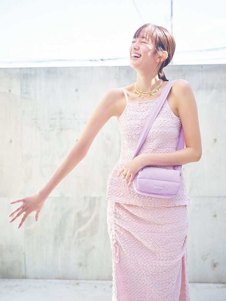 佐藤栞里。ar5月号より バッグ[W18.5×H13.3×D4.5 ㎝]¥8,390/ビヨンド ザ バインズ(リディア) トップス(ベア付 き)¥35,200、スカート¥41,800/オープン セサミ クラブ ネッ クレス¥9,900/ファーファー リング(右手)¥2,640、(左手・3 個セット)¥3,960/アネモネ(サンポークリエイト)