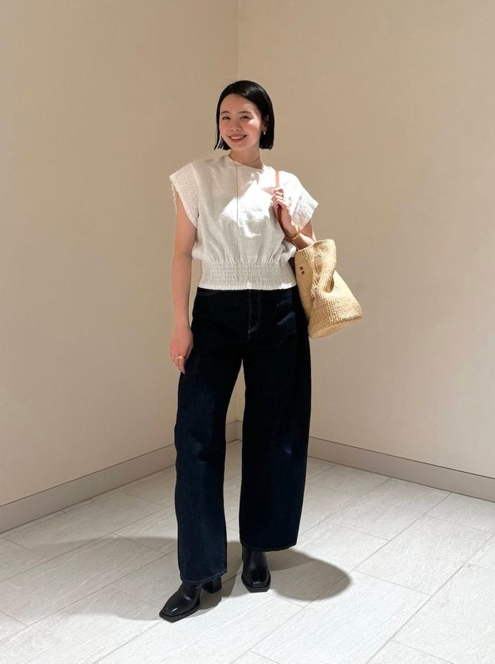 「涼し気な夏の装いに、太陽のように輝くゴールドジュエリーで重厚感をプラス。シルエットやデザインにひとひねりあるアイテムを合わせることで、キレイめながらもモードなスタイリングを意識しました」