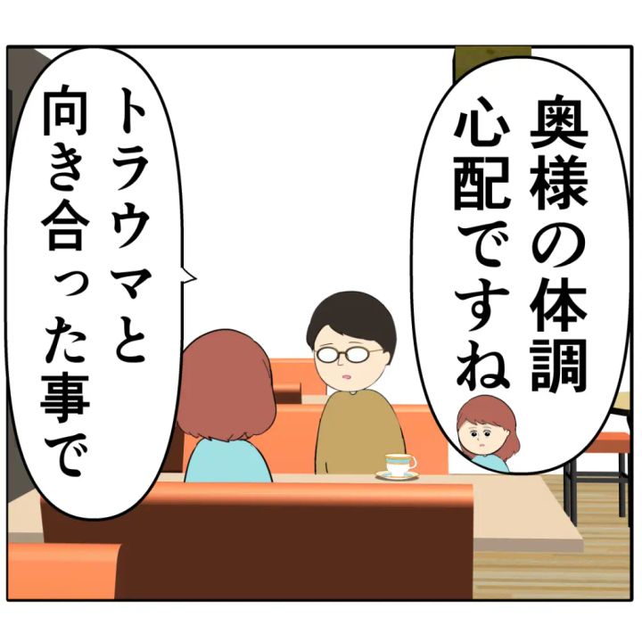 ジュリ実さんがもう自分のところへ来ないかどうかを知りたくてめが根さんにジュリ実さんの近況を尋ねためいさん。嫌な記憶のフラッシュバックや母親の幻覚に悩まされたというジュリ実さんの状況を聞き「奥様の体調心配ですね」と表面は心配そうな素振りをしました。めが根さんはまたジュリ実さんの状況について話し始めました。「トラウマと向き合ったことで」