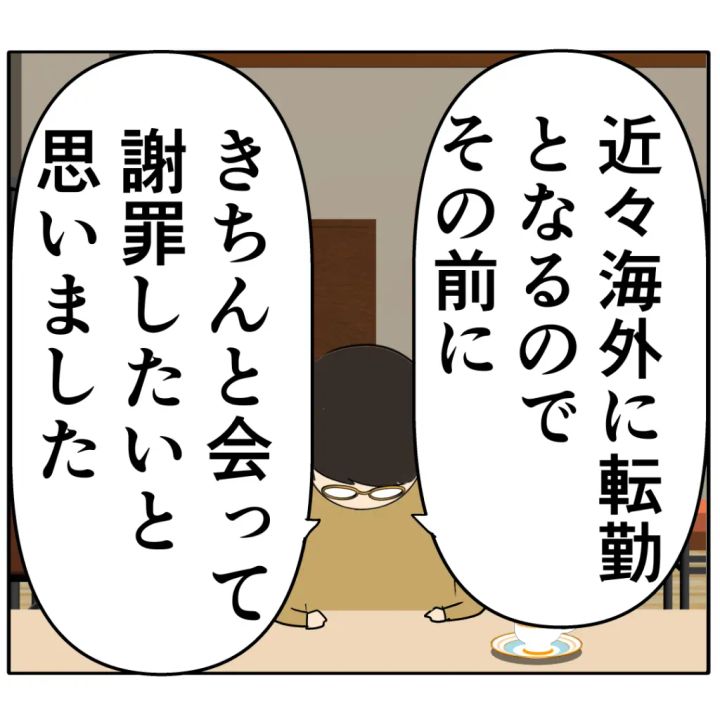 「近々海外に転勤になるので、その前にきちんと会って謝罪したいと思いました」と言って、めが根さんは改めてめいさんに頭を下げました。めが根さんがめいさんを呼び出したのはこれを伝えるためだったのです。