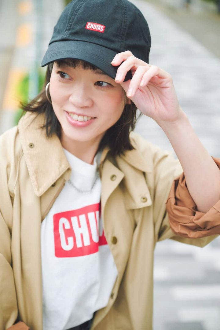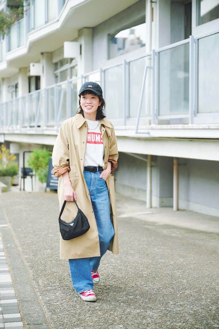 カジュアル感の強いCHUMSのTシャツは、デニムやベージュのスプリングコートを合わせることでタウン仕様に。Tシャツのロゴ&コンバースでリンクさせた赤色がブルーデニムに映えます。ショッピングやお出掛けにも馴染み、大人の遊び心が感じられる洗練コーデに。
