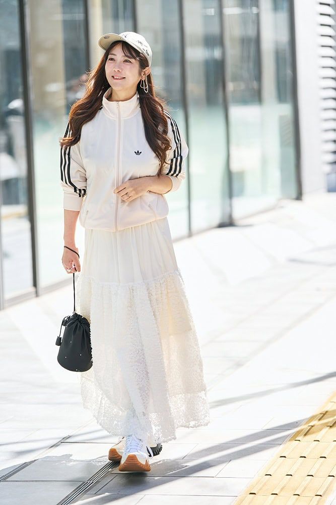 ふんわり可愛い白スカートは、adidasのジャージ合わせで程よい甘さに。トップス、ボトムスは白メインで可憐なイメージが強いため、スニーカーは靴底がしっかりしたものを選ぶことでコーデ全体がキュッと引き締まります。