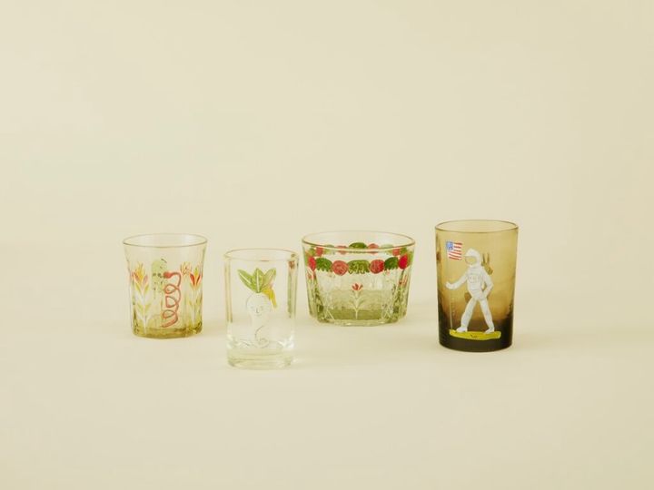 美しいガラスにユニークな絵柄が描かれた、なんとも楽しい器。この絵は、「沖縄おもしろカルタ」でもお馴染みの「玩具ロードワークス」を主宰する豊永盛人さんによるものです。倉敷のガラス作家・石川昌浩さんが作り上げた器に、エナメル彩で描かれた絵が、唯一無二の魅力を放っています。これが食卓に並んだ瞬間、まるで卓上に花が咲いたような感覚になります。民藝に通ずる二人から生まれたこともあってか、民藝の器ともとても相性が良いのです。