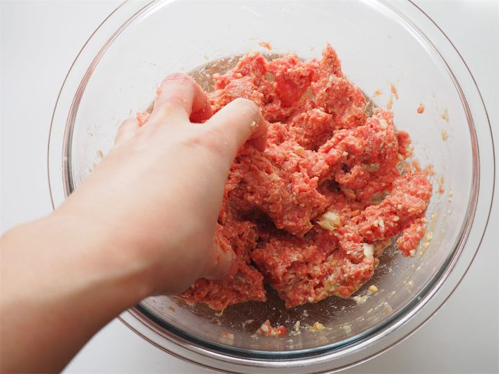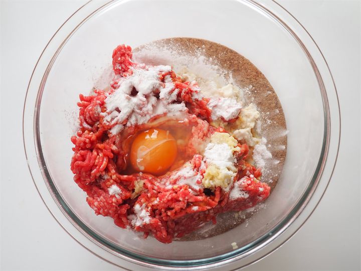2. 1のボウルにひき肉、すりおろしたにんにく、しょうゆ(ハンバーグ用)、卵、片栗粉を入れ、粘りが出るくらいに練り混ぜ合わせる。