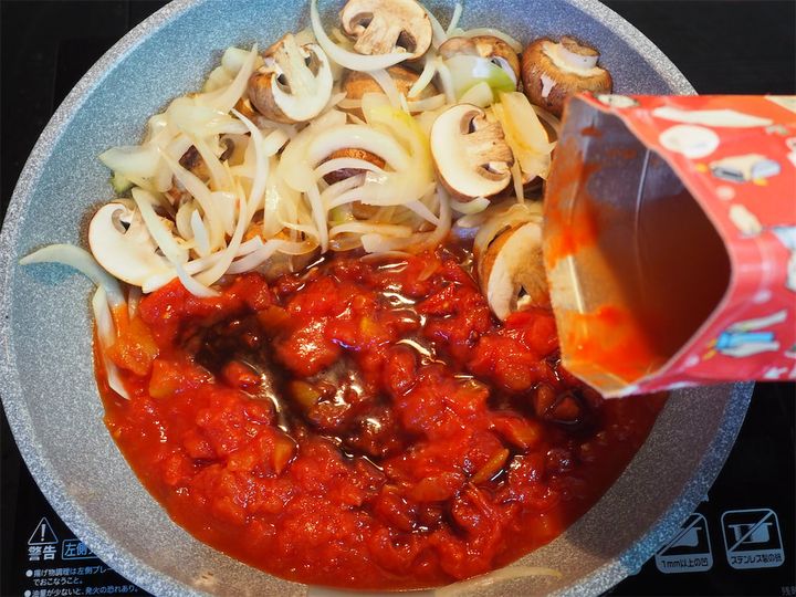 10. 玉ねぎとマッシュルームを端に寄せ、トマト缶、水、5の合わせ調味料を入れ混ぜ合わせる。