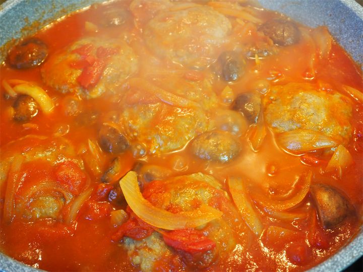 トマトソースからハンバーグが頭を出した状態で煮込むので、適宜トマトソースをハンバーグにかけながら煮込んでいきましょう。