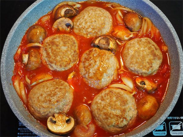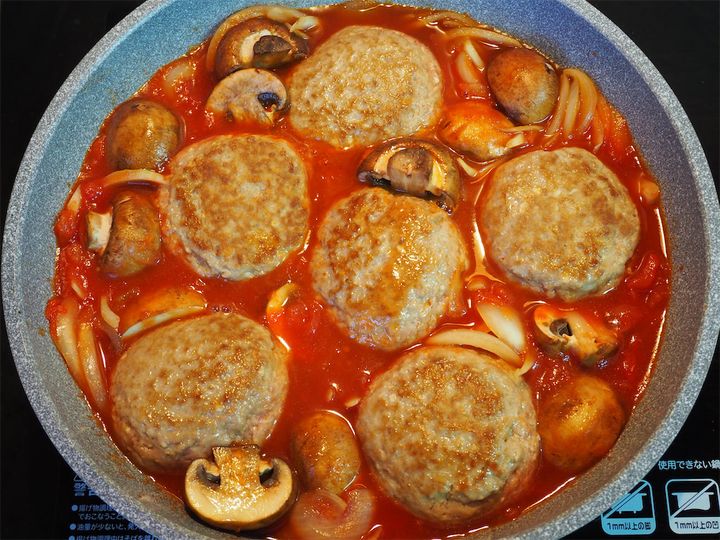 11. トマトソースがふつふつしてきたら弱火にし、ハンバーグを入れ戻したらフタをして10分煮込んでいく。