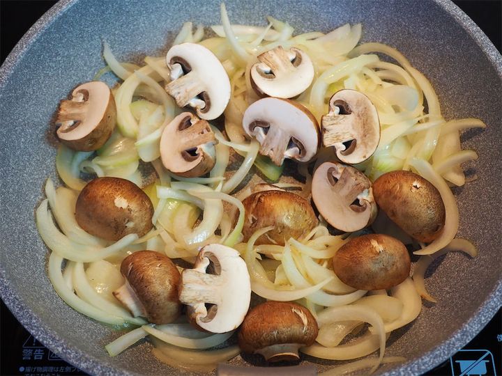 9. 玉ねぎがしんなりしたら、4のマッシュルームを入れ軽く混ぜ合わせるように炒める。