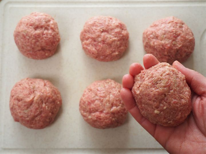 煮込みハンバーグなので丸く成形。ふんわりやわらかくなるそうです♪ぽたぽたした肉だねで、なんだか愛おしくなってきます。