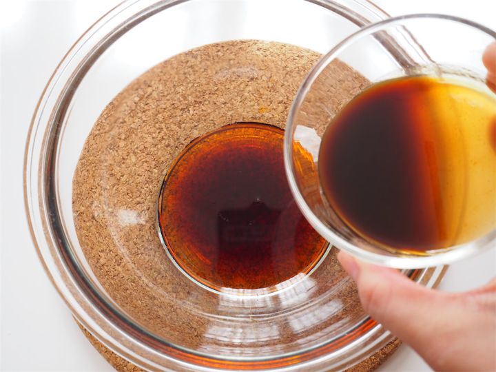 5. 2とは別のボウルにしょうゆ(ソース用)、みりん、中濃ソースを入れ、混ぜ合わせる。