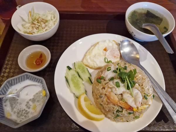 こちらの写真はエビチャーハンのセットです。ゴロっとしたエビが乗っていて、とても風味豊かでした。パクチーやナンプラーと一緒に食べると、また違った味わいも楽しめます。