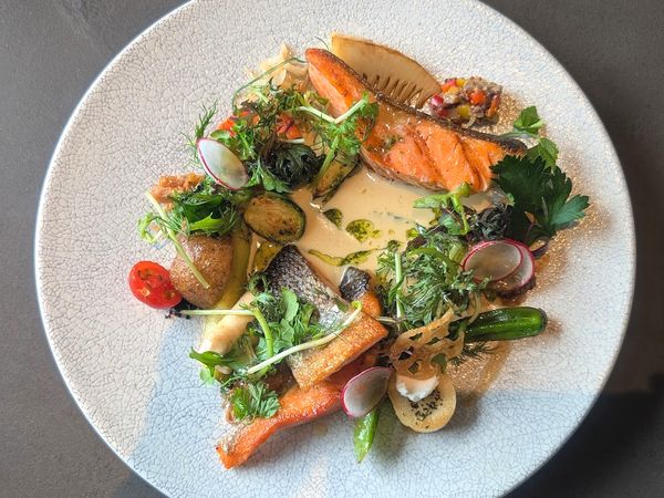 お刺身で食べられるほど新鮮なサーモンを焼き上げ、魚の出汁や日本酒などを合わせたクリームソースで仕上げています。パプリカと粒マスタードで和えた特製いぶりがっこが絶妙なアクセントに。分厚いサーモンが外はカリッと中はふわっと焼きあがっていて、クリームソースとマッチしていましたよ。