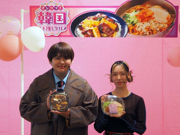 発表会には、人気YouTuber・パパラピーズのおふたりもゲストとして登場。今回のフェアの中から気になった商品を聞かれると「スップルグイチキン丼です! 甘辛なタレが絡んだ、食べごたえのありそうなチキンに惹かれます」(じんじんさん)、「普段から冷麺が大好きな私は、やはりこのビビン冷麺です。試食しましたが、麺もちゅるちゅるでおいしい」(タナカガさん)、と、それぞれの“推し”グルメを語ってくれました。