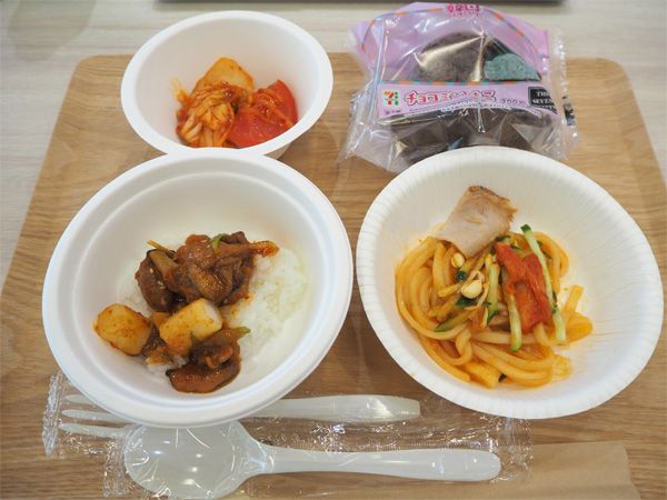 発表会ではフェア商品の中から「ビビン冷麺」「スップルグイチキン丼」「トマトキムチ」「カルビクッパ」「チョコミントもこ」の5品を試食。