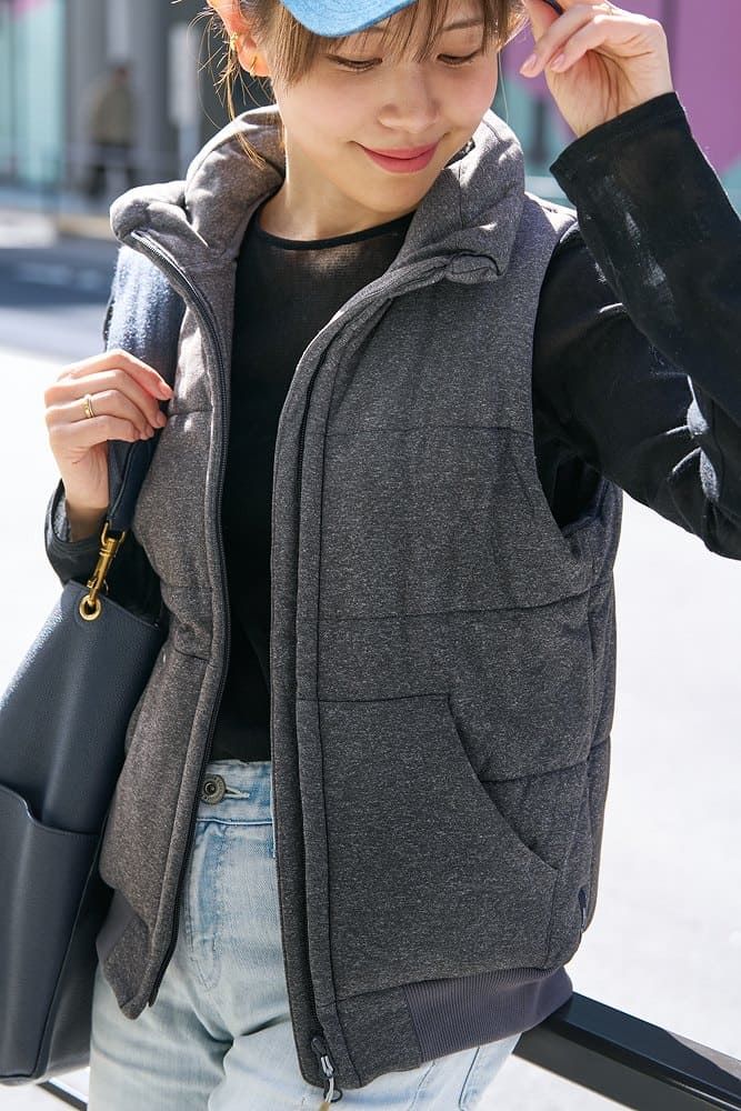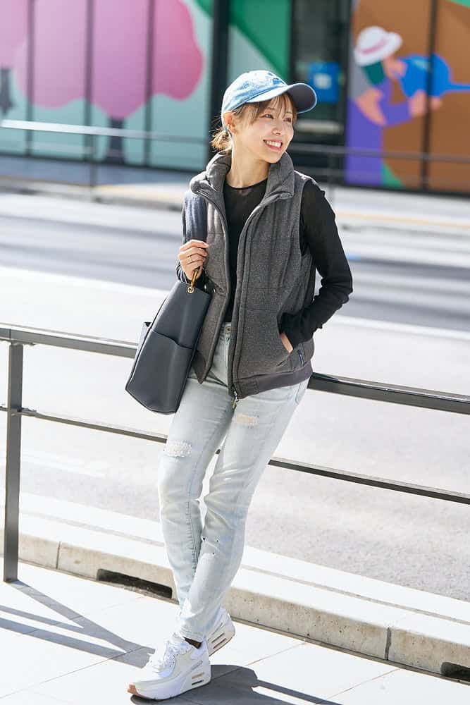 肌寒い日に重宝するコンパクトなダウンベストは、スタイルアップにも効果的。中にブラックのインナーを着ることでシルエットが綺麗にまとまります。ボトムスは重たくならないようライトブルーのデニムをチョイス。厚底スニーカーはこちらもスタイルアップが叶う上、子供のお迎え後に公園で遊ぶ時にも◎。