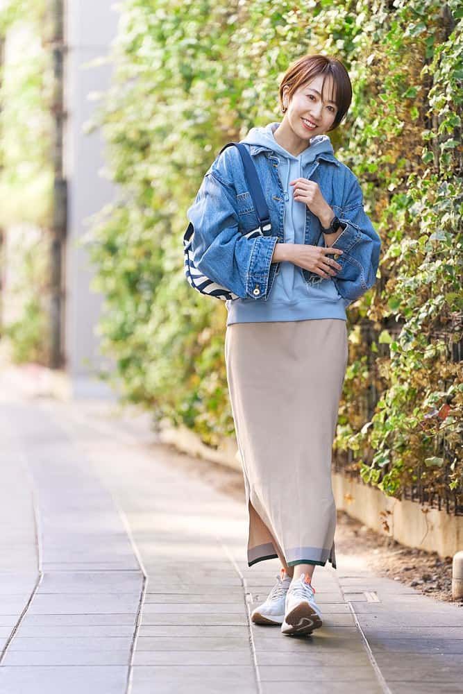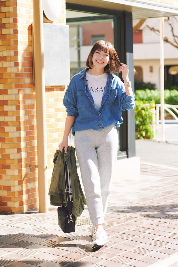 動きやすいグレーのパンツにTシャツ&デニムシャツを合わせ、定番のスポカジでもこなれ感や抜け感のあるコーデに。友人との予定が入る場合に備えて、バッグやアクセサリーで華やかさをプラス。白スニーカーと足首の肌見せで、足元もすっきりオシャレにまとまります。