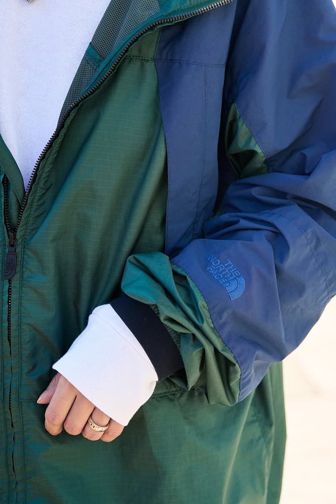 シックなカラーのナイロンブルゾンはノースフェイスのもの。重くならないダークブルーとモスグリーンの色合わせが大人っぽく、スポーティすぎないため日常使いしやすい一着です。インナーとスカートは白でまとめ、爽やかさと季節感を取り入れて。カラーリングが楽しい、褒められNIKEスニーカーをコーデのアクセントに。