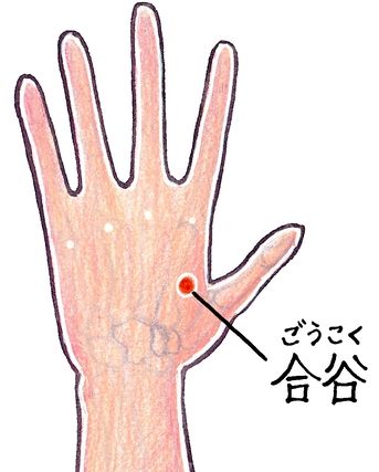手の甲側、親指と人差し指の骨が交わる部分、やや人差し指寄りの少しくぼんだところにあります。万能のツボとも呼ばれ、全身の様々な不調に効果があるツボです。