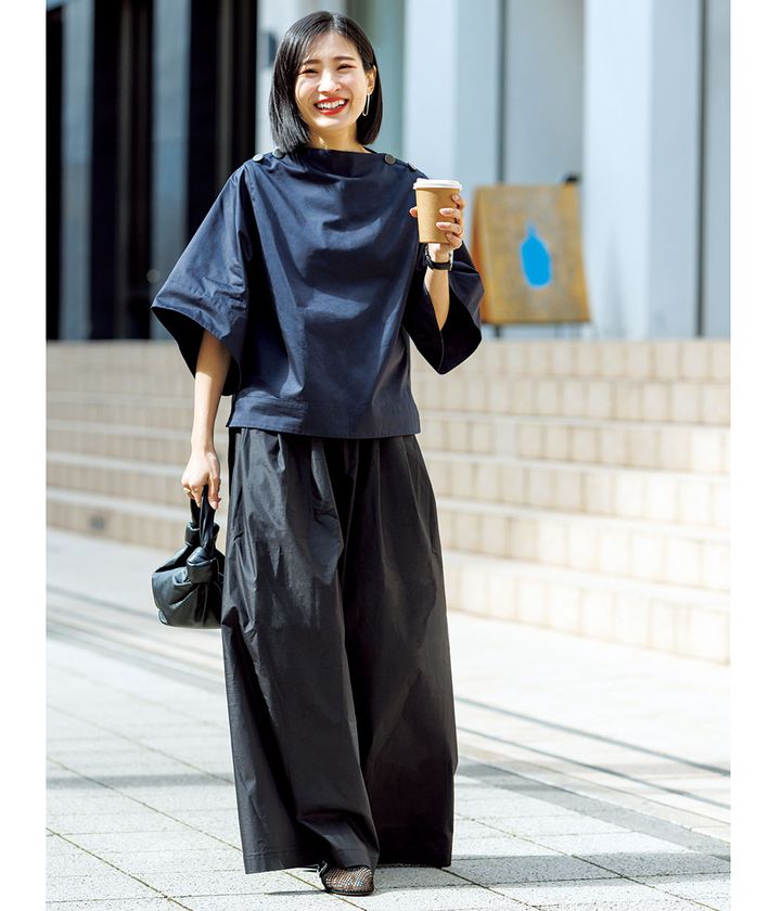 『ネイビーブラウスはシャカ素材のワイドパンツで甘さを引き算。甘さが際立つのは苦手なので、可愛くなりすぎないよう、ワイドパンツでマニッシュに。メッシュのシューズで抜け感も忘れません。』