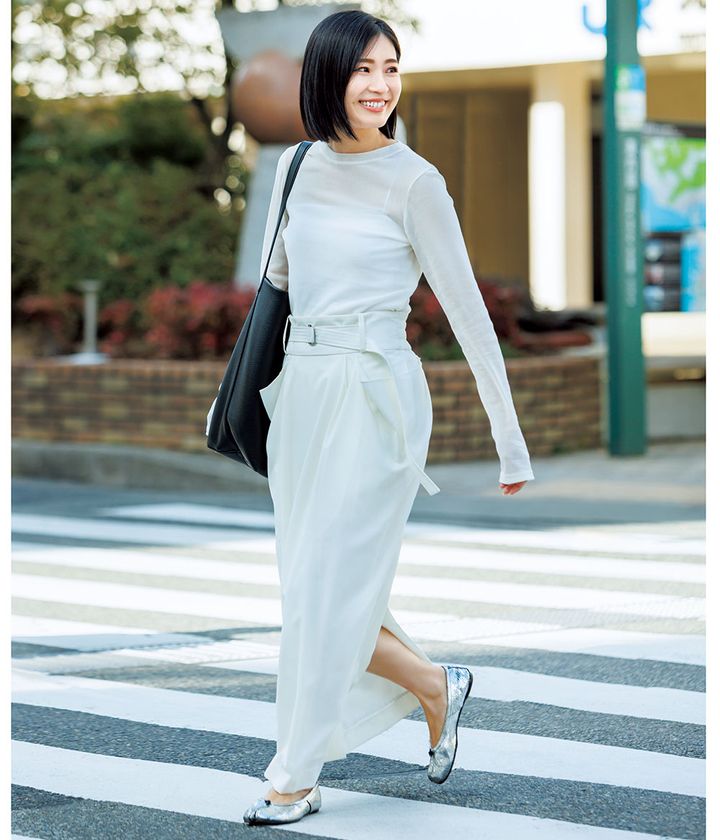『ホワイトコーデは素材感をのっぺりさせずスタイリッシュに。会社での打合わせは自宅の大阪から神戸まで電車で。シアートップスは白を選べば顔映りもよく、好印象に見えていいことずくめです。』