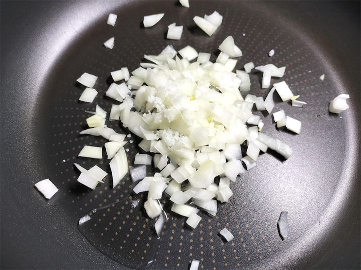 5. フライパンにサラダ油を引いて玉ねぎを入れ、塩を振って中火にかけます。