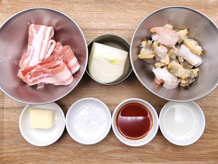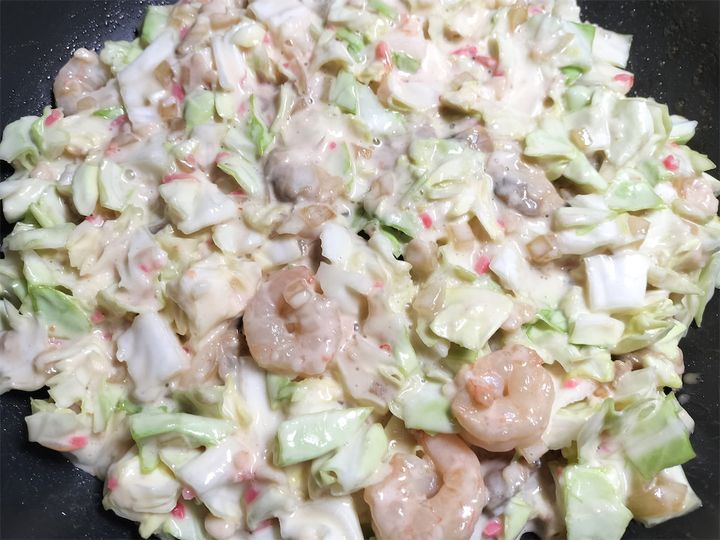 6. 解凍したシーフードミックス、バター、しょうゆを加えてさっと炒め、粗熱が取れたら4のボウルに加えて混ぜます。生地の完成です。
