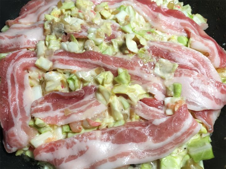 8. 生地に軽く塩をした豚肉を乗せ、その上に残しておいた生地を乗せます。