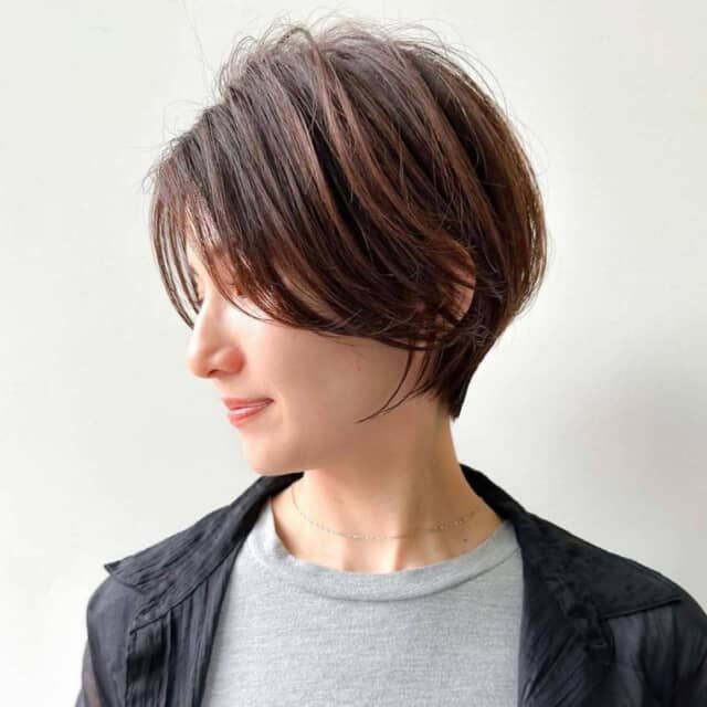 まず注目したいのが、2025夏の本命スタイル「くびれショート」。首元はキュッとタイトに引き締めつつ、トップに程よくボリュームを持たせることで、全体に立体感と軽やかさをプラス。うなじを出すことで見た目も涼しく、汗ばむ季節でも快適に過ごせます。