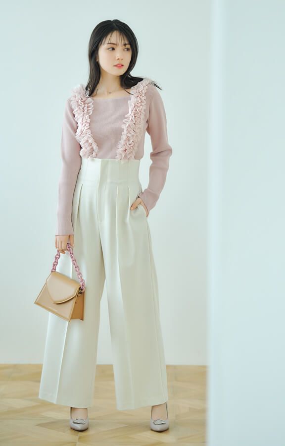 きちんと見えしながら抜け感も出せる、ニュアンシーなホワイトパンツ。ニットのチュール装飾が軽やかさを後押し。