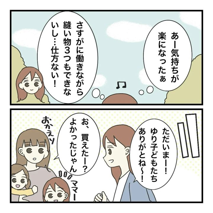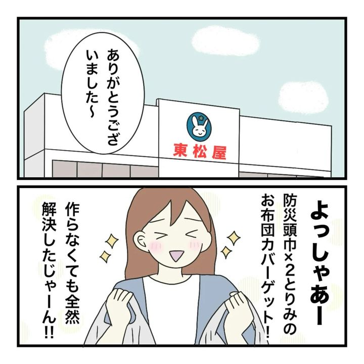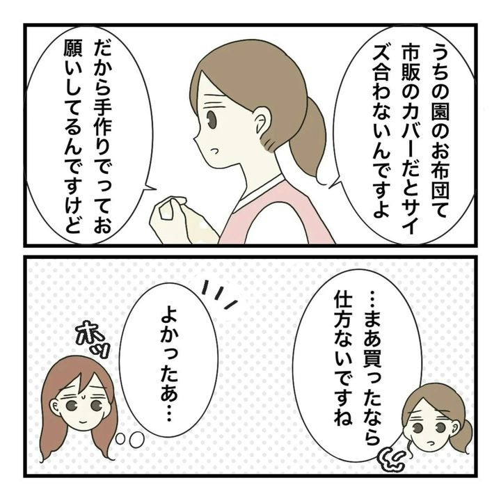 仕事をしながら育児と家事をワンオペでこなすまりなは、さすがに布団カバーや防災頭巾を短期間で用意することは無理だと考え、市販品を用意しました。園に持参したところ、「買いました?」のという一言が…。