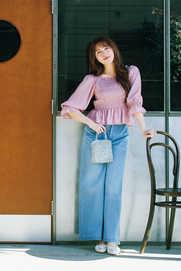 コーデを下重心に誘導するワイドデニムは、骨ストの体形カバーに最適。スクエアネックやとろみ素材など、上半身を華奢見えさせるデザインの春色ブラウスでフェミニンに振って。