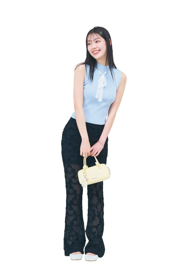ブルーニットタンクトップは着回し。黒レースパンツ 17,600円/HONEY MI HONEY ヘアピン(3個セット)1,870円、ネックレス 2,420円、リング(2個セット)1,980円/以上GOLDY ブレスレット 23,100円/BayBee バッグ 12,900円/チャールズ&キース(チャールズ&キース ジャパン)キーホルダー 1,690円/NADIA FLORES EN EL CORAZON パンプス 2,990円/神戸レタス