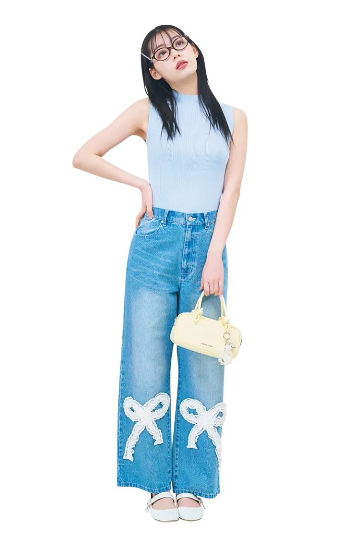 ブルーニットタンクトップは着回し。リボンデニムパンツ/merry jenny ヘアピン(2個セット)1,540円/アネモネ(サンポークリエイト)メガネ 1,320円/スピンズ バッグ 12,900円/チャールズ&キース(チャールズ&キース ジャパン)キーホルダー 1,690円/NADIA FLORES EN EL CORAZON パンプス 2,990円/神戸レタス